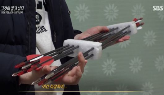 창원 모텔 살인 사건의 20대 용의자 집에서 발견된 화살.[SBS ‘그것이 알고 싶다’ 캡처] |