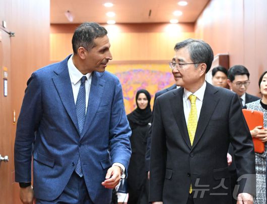 (서울=뉴스1) = 조현 외교부 장관이 15일 서울 종로구 외교부 청사에서 칼둔 칼리파 알-무바락 아랍에미리트연합국(UAE) 행정청장을 접견하고 있다.(외교부 제공. 재판매 및 DB 금지) 2026.1.15/뉴스1photo@news1.krCopyright ⓒ 뉴스1. All rights reserved. 무단 전재 및 재배포, AI학습 이용 금지.