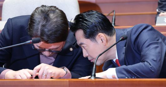 국민의힘 장동혁 대표(오른쪽)가 15일 국회에서 열린 당 의원총회에서 신동욱 최고위원과 귀엣말을 하고 있다. 장 대표는 이날부터 더불어민주당을 대상으로 ‘통일교·공천뇌물 의혹’ 관련 특검법 처리를 요구하며 단식 농성에 돌입했다. 허정호 선임기자 ⓒ 세상을 보는 눈, 세계일보