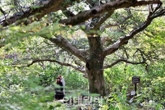 겨울에도 녹음이 짙게 내려앉은 제주 평대리 비자나무숲(비자림)의 연리지 나무 |