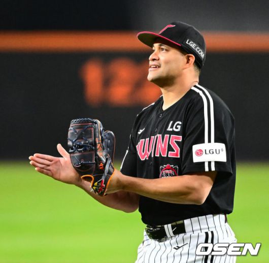 [OSEN=대전, 지형준 기자] 30일 대전 한화생명볼파크에서 2025 신한 SOL Bank KBO리그 포스트시즌 한국시리즈 4차전 한화 이글스와 LG 트윈스의 경기가 열렸다.이날 경기에 한화는 와이스를, LG는 치리노스를 선발투수로 내세웠다. 1회말 수비를 마친 LG 치리노스가 세리머니를 하고 있다. 2025.10.30 / jpnews@osen.co.kr |