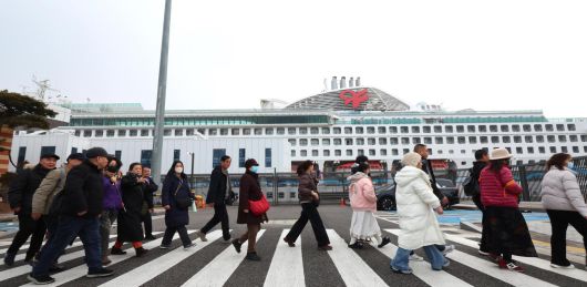 중국 정부가 자국민의 일본 관광과 일본 문화 콘텐츠 수입을 제한하는 ‘한일령(限日令)’ 여파로 중국발 크루즈선의 인천항 입항이 늘어나고 있다. 15일 인천 연수구 인천항 크루즈터미널에 입항한 중국 톈진동방국제크루즈사의 7만7000t급 ‘드림호’에서 내린 중국인 단체 관광객이 이동하고 있다.