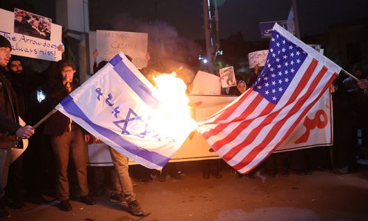 지난 14일(현지시간) 이란 테헤란에 위치한 영국 대사관 앞에 모인 이란인 대학생 시위대가 성조기와 이스라엘 국기를 불태우고 있다. 로이터연합뉴스 |