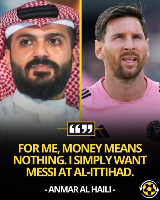 그는 이어서 "나에게 돈은 아무 의미가 없다. 내가 원하는 건 오직 메시다. 그건 곧 축구 역사상 최고의 선수를 보유한다는 의미이기 때문이다"라면서 "당시 나는 메시에게 14억 유로를 제안했다. 그는 가족을 이유로 그 거액을 거절했다. 가족을 설득했음에도 불구하고, 결국 가족이 돈보다 중요하다는 이유로 제안을 받아들이지 않았다. 나는 그 결정을 존중한다. 알이티하드는 언제나 메시에게 열려 있다. 그는 원할 때 언제든 올 수 있다"라며 다시 한 번 러브콜을 보냈다.