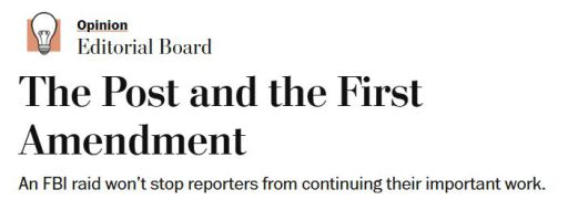15일(현지 시각) 미국 유력 매체 워싱턴포스트(WP)는 “워싱턴포스트와 수정헌법 제1조”라는 제목의 사설에서 “이번 급습이 기자들의 자신의 직무를 수행하는 것을 저지할 것이라고 믿는 사람이 있다면 큰 착각”이라고 하면서 이렇게 밝혔다.