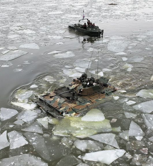 /연합뉴스 15일 오전 강원도 철원군 강포저수지에서 육군 수도기계화보병사단이 ‘파빙 도하 훈련’을 하고 있다. 파빙 도하 훈련은 한겨울 얼어붙은 강이나 호수를 건너는 훈련이다. 폭약 등으로 두꺼운 얼음을 깨 물길을 낸 뒤 도하한다. K-21 장갑차가 저수지를 건너고 있다. [조선일보] - Copyrights ⓒ 조선일보 & chosun.com, 무단 전재 및 재배포 금지 -
