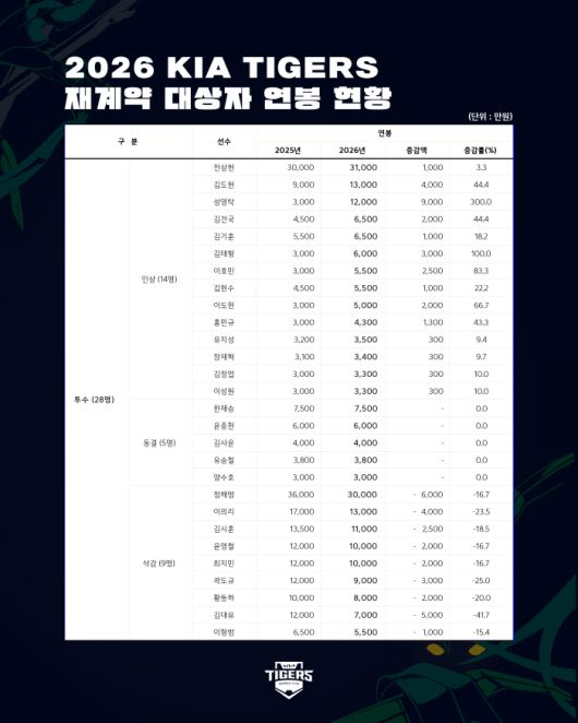 KIA는 15일 '2026년 시즌 연봉 재계약 대상자 48명과 계약을 마무리했다. 재계약 대상 중 인상된 선수는 25명이며 동결 7명, 삭감 16명'이라고 발표했다.