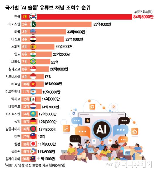 이런 AI 슬롭은 전세계에서 한국이 가장 심각한 것으로 알려졌다. AI 영상편집 플랫폼 카프윙이 지난해 국가별 인기 유튜브채널 상위 100개를 분석한 결과 한국 기반 AI 슬롭 채널의 누적 조회수는 84억5000만회로 조사대상 국가 중 가장 많았다. 2위 파키스탄(약 53억회) 3위 미국(약 34억회)과 비교했을 때 압도적으로 높은 수치다.