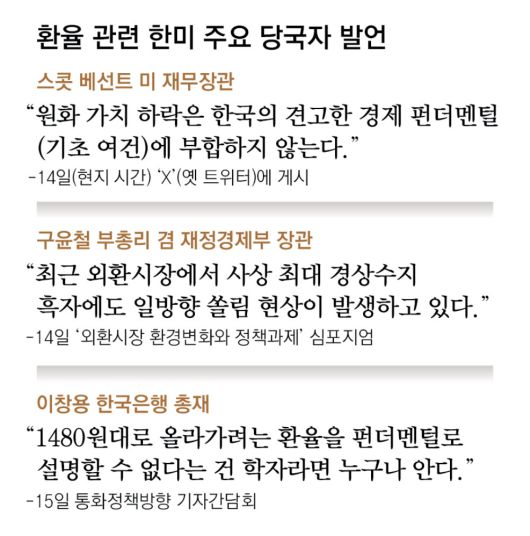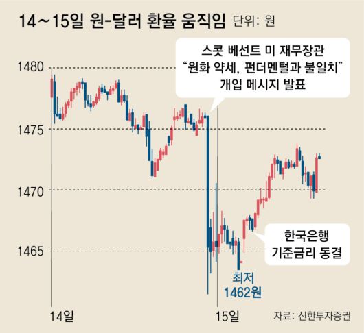스콧 베선트 미국 재무장관이 한국 원화 가치 하락에 이례적으로 강한 구두 개입성 메시지를 내놨지만 환율 상승세를 잡지 못했다. 원-달러 환율은 베선트 장관의 메시지가 공개된 뒤 반짝 하락했지만 15일 장중 1470원을 다시 넘겼다.