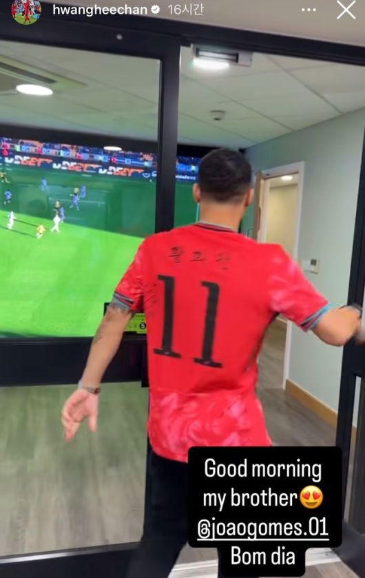 최근 황희찬 SNS에 주앙 고메스가 등장했다. 황희찬은 13일 개인 SNS에 주앙 고메스가 대한민국 유니폼을 입고 있는 영상을 게시하며 "좋은 아침이야, 내 동생"이라는 글을 남겼다. 주앙 고메스는 황희찬 이름과 등번호 11번이 적힌 유니폼을 입고 해맑은 모습을 보였다.