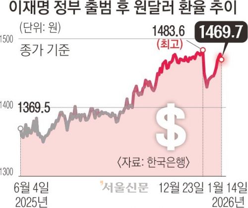 한국은행 금융통화위원회도 이날 새해 첫 통화정책방향 회의에서 ‘고환율’을 이유로 기준금리를 연 2.50%로 5연속 동결했다. 이창용 한국은행 총재는 기자간담회에서 “환율이 중요한 결정 이유였다는 것은 부정할 수 없는 사실”이라며 “환율이 지난 연말 40원 이상 하락했지만 올해 들어 다시 1400원대 중후반 수준으로 높아져 상당한 경계감을 유지해야 한다”고 말했다. 이어 “한국 경제의 펀더멘털이 환율에 영향을 미치지만, 이 외에 수급 요인도 작용하고 있다”고 진단했다.