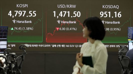 15일 서울 중구 하나은행 딜링룸 전광판에 지수가 표시되고 있다. 이날 서울 외환시장에서 스콧 베선트 미국 재무장관의 ‘구두 개입’으로 1460원대까지 떨어졌던 원달러 환율은 다시 반등해 1470원대를 넘나들며 불안한 모습을 보이다 전날보다 7.8원 내린 1469.7원에 마감했다. 코스피는 전 거래일보다 74.45포인트(1.58%) 상승한 4797.55에 마감했다. 뉴시스 |