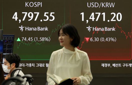 15일 코스피가 전 거래일(4723.10)보다 74.45포인트(1.58%) 상승한 4797.55에 마감한 15일 오후 서울 중구 하나은행 딜링룸 전광판에 지수가 표시되어 있다. 코스닥 지수는 전 거래일(942.18)보다 8.98포인트(0.95%) 오른 951.16, 서울 외환시장에서 원·달러 환율은 전 거래일(1477.5원)보다 7.8원 내린 1469.7원에 주간 거래를 마감했다. 2026.01.15. 뉴시스 |