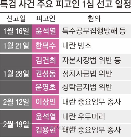 이밖에도 오는 28일엔 김건희 특검이 기소한 김건희 여사의 도이치모터스 주가 조작 등 사건과 통일교 ‘정교유착’ 관련 권성동 국민의힘 의원·윤영호 전 통일교 세계본부장 사건의 선고도 나온다. 특검은 여사에게 징역 15년과 벌금 20억원을, 권 의원과 윤 전 본부장에게는 각각 징역 4년을 구형했다.