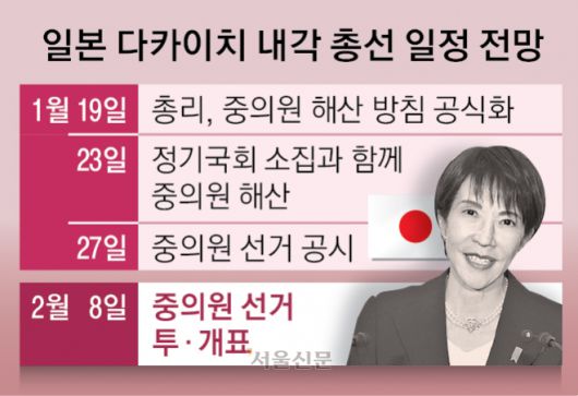 15일 도쿄신문 등 일본 매체 등에 따르면 다카이치 총리는 전날 이재명 대통령이 일본을 떠난 직후 여당인 자민당과 일본유신회 간부들과 만나 중의원 해산 방침을 공식화했다. 정기국회 개회와 동시에 중의원을 해산하고, 2월 8일 총선을 실시하는 방안이 유력하게 거론된다.