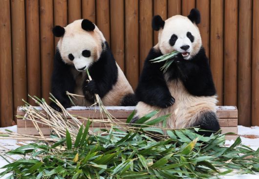 쌍둥이 판다 눈 위에서 식사 - 15일 경기 용인 에버랜드에서 쌍둥이 판다 루이바오와 후이바오가 눈 위에서 대나무 먹이를 먹고 있다. 연합뉴스 |