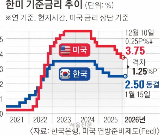 이를 두고 한은의 기준금리 동결 기조가 상당 기간 이어질 가능성이 크다는 관측이 제기된다. 외환당국이 지난 연말부터 환율 종가를 낮추기 위해 각종 대책을 펼쳤지만 ‘백약이 무효’였다. 지난 연말 고강도 구두개입과 국민연금의 대규모 환헤지(위험 회피), 외환보유액 26억 달러(한화 3조 8220억여원) 투입 등으로 연말 종가를 1439.0원으로 낮췄지만, 환율은 올해 들어 제자리로 되돌아가고 있다. 한미 기준금리 역전의 장기화도 기준금리를 인하하지 못하는 배경이다. 현재 기준금리는 한국이 연 2.50%, 미국이 연 3.50∼3.75%로, 상단 기준 1.25% 포인트 차이가 난다. 국내 시장금리가 미국보다 낮으면 외국인 투자 자금의 유출을 자극해 환율 상승 압력으로 작용한다.
