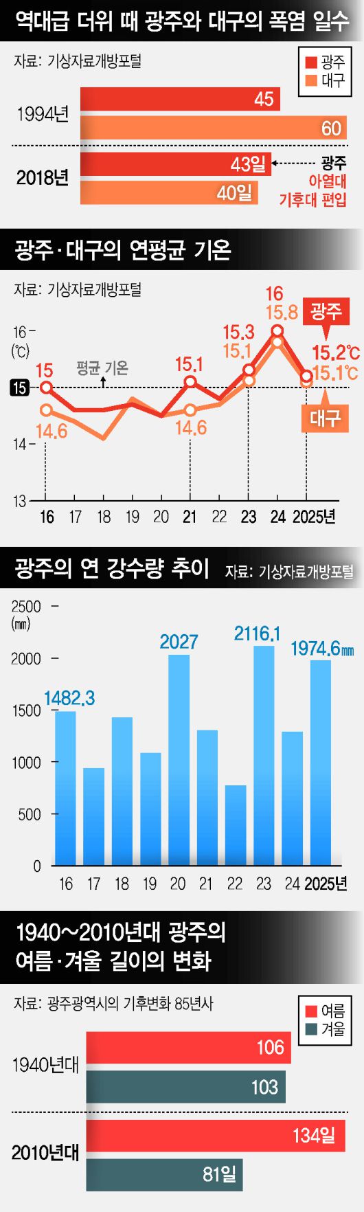 그런데 최근 대구 위상에 도전하는 더운 도시가 나타났다. 바로 광주광역시다. 광주는 2000년대 이후 폭염 문제에서 대구와 경쟁하고 있다. 역대급 폭염이었던 2018년의 폭염일수는 광주가 대구를 앞섰다. 한겨레 분석에서, 광주가 아열대권에 포함된 시기도 2018년으로 대구의 2023년보다 5년 이르다. 평균 기온 15도를 넘은 해가 대구는 2023~2025년 3년이었지만, 광주는 2016년과 2021년, 2023~2025년 등 5년이었다. 광주는 2018년께부터 ‘광프리카’로 불리기 시작했다.