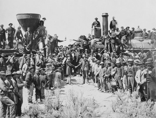 1869년 5월10일 미국 프로몬토리 서밋에서 대륙횡단철도 완공을 기념해 찍은 공식 기념사진이다. 철도를 만든 중국인과 아일랜드인은 단 한명도 보이지 않는다. 당시 자본과 정치세력이 노동자와 이민자의 존재를 지우려 했기 때문이다. 출처는 미국 의회도서관. 메멘토 제공 |