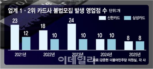 연도별로 보면 신한카드에서는 2021~2023년 불법 모집 사례가 자주 적발됐다. 2021년 23곳, 2023년 24곳, 지난해는 8곳의 영업점이 각각 불법 모집이 일어난 것으로 나타났다. 삼성카드에서는 2022~2024년 매년 10곳의 영업점에서 불법 모집이 발생해 적발됐고 지난해 8곳으로 각각 집계됐다.