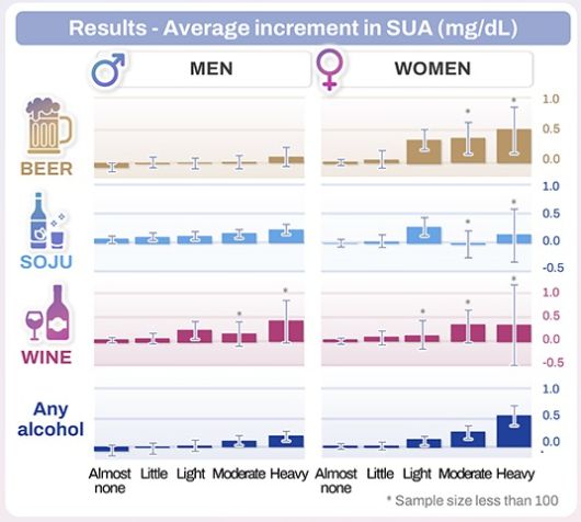 그 결과 소주·맥주·와인 모두 음주량이 증가할수록 혈중 요산 수치가 상승하는 경향을 보였다. 다만 요산 증가와 더 강하게 연관된 술의 종류는 성별에 따라 달랐다. 남성은 소주 섭취가 요산 수치에 가장 강한 영향을 끼쳤고, 하루 소주 반 잔 정도만 마셨을 때도 요산 수치가 증가했다. 반면 여성은 맥주 섭취가 요산 수치 상승을 더 크게 부추겼다. 여러 주종을 섞어 마셨을 땐 남녀 모두에서 요산 수치가 더 높아지는 경향을 보였다. 연구팀은 "맥주와 소주는 와인에 비해 한번 음주 시 소비량이 많은 탓에 요산 상승에 미치는 '양적 효과'가 더 클 수 있다"고 봤다. 요산 관리를 위해서는 술의 종류 뿐 아니라 1회 음주량을 줄이는 것이 중요하다는 것이다.