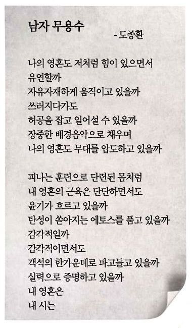 도종환 전 문화체육관광부 장관이 인터뷰 직전에 건넨 시다. 시 제목은 ‘남자 무용수’. 지난해 12월 2일 세종문화회관 대극장에서 열린 ‘제12회 이데일리 문화대상’ 시상식에 참석했던 그는 “시상식에서 프런티어상을 수상한 무용수 겸 안무가 최호종의 축하 공연에서 영감을 받아 쓴 시”라며, 환하게 웃었다.
