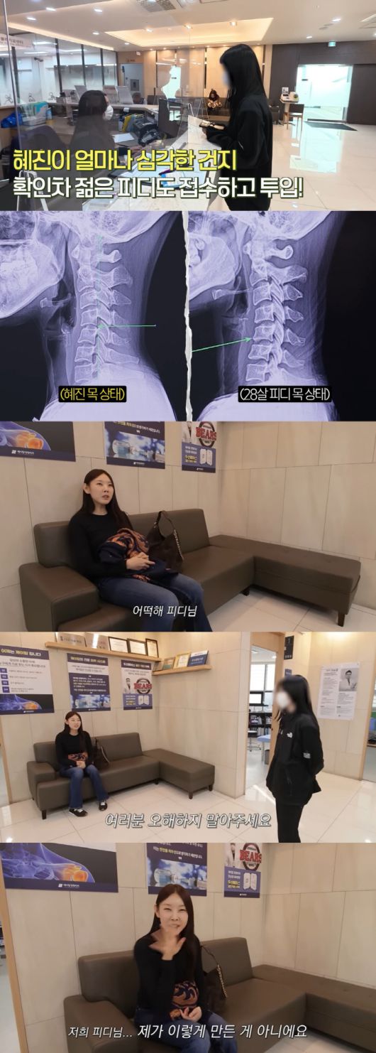 앞서 한혜진의 목 상태가 얼마나 심각한지 비교해보기 위해 젊은 PD도 목 사진을 찍었다. 하지만 의사는 "더 안 좋다"며 PD의 목 사진을 보여줬고 한혜진은 깜짝 놀라 PD를 진료실로 데려왔다.