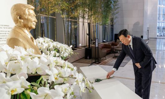 신동빈 롯데그룹 회장이 15일 서울 송파구 롯데월드타워 1층에 마련된 신격호 창업주 흉상에 헌화하고 있다. 롯데그룹 제공 |