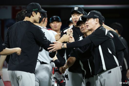 KT 이강철 감독이 11일 서울 잠실구장에서 열린 2025 KBO리그 LG와 경기 후 선수들과 하이파이브를 하고 있다. 잠실 | 최승섭기자 thunder@sportsseoul.com |