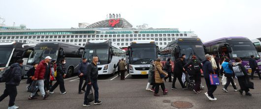 중국의 ‘한일령’(限日令) 여파로 중국발 크루즈 인천항 입항이 급증하고 있는 가운데 지난 15일 인천 연수구 국제크루즈터미널에 입국한 중국 톈진동방국제크루즈의 ‘드림호’(7만7천t급) 승객 중국인 관광객들이 버스로 이동하고 있다. [연합] |