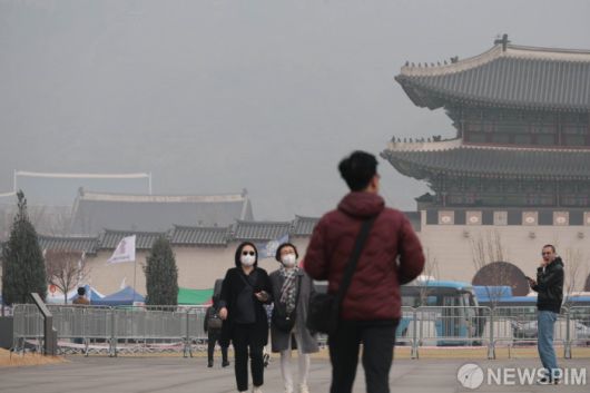 [서울=뉴스핌] 이길동 기자 =서울·인천·경기 초미세먼지 주의보 발령된 25일 오전 외국인 관광객들이 서울 광화문 광장을 거닐고 있다. 2025.03.25.gdlee@newspim.com |