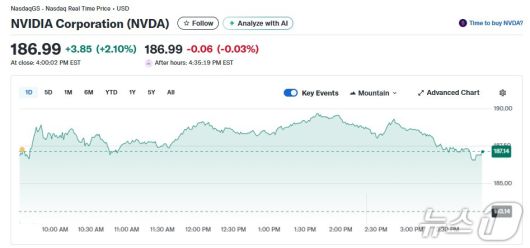 15일(현지 시각) 뉴욕증시에서 엔비디아는 2.10% 상승한 186.99달러를 기록했다. 이에 따라 시총도 4조5540억달러로 늘었다.