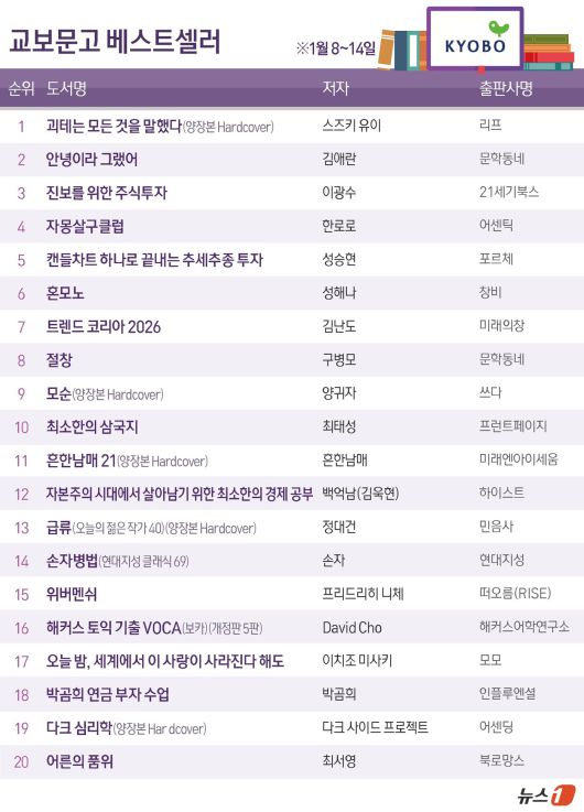 6위에는 성해나의 소설집 '혼모노', 7위에는 김난도의 '트렌드 코리아 2026'이 각각 이름을 올렸다.