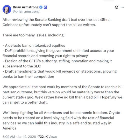 이번 연기 결정의 도화선은 코인베이스의 공개 반대였다. 브라이언 암스트롱 코인베이스 최고경영자(CEO)는 15일(현지시간) 엑스(X)를 통해 “지난 48시간 동안 상원 법안 초안을 검토한 결과 현재 안을 지지할 수 없다는 결론에 이르렀다”며 “나쁜 법안보다는 차라리 법안이 없는 편이 낫다”고 꼬집었다.