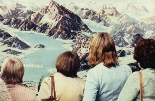 여행객 네 명이 호수의 풍경을 보고 있다. 아니다. 다시 보니 실제 풍경이 아닌 풍경을 묘사한 그림, 정확히는 등산 코스 안내도를 보고 있다. 왜 착각했을까? 여성들로 보이는 여행자들의 갈색 머리카락과 빛바랜 그림의 산과 색이 비슷하고, 오른쪽 두 명이 입은 재킷도 호수의 물색과 비슷하다. 이탈리아 사진가 루이지 기리는 1977년 오스트리아 잘츠부르크의 몬트제 빙하 호수를 안내하는 그림 앞에서 이 사진을 찍었다. 이 알쏭달쏭한 사진의 의미는 뭘까?