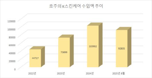 K뷰티 입장에서 호주는 14대 수출 시장으로 절대적인 규모(수출비중 1.4%)로 보면 아직 크지 않다. 하지만 최근 3년간 연평균 수출 증가율이 2023년 46.8%, 2024년 56.4%, 2025년(8월 기준) 46.3%로 견조하다. 향후 시장 확대 여지가 크다는 잠재력 측면에서 최근의 성과가 의미 있다는 분석이 나온다. 특히 호주는 다양한 인종과 문화가 있는 다문화 국가로, 최근엔 이민자들이 더 늘면서 아시아계 인구가 급속도로 늘었다. 이들을 중심으로 K뷰티 수요가 확대되고 있단 분석이다.