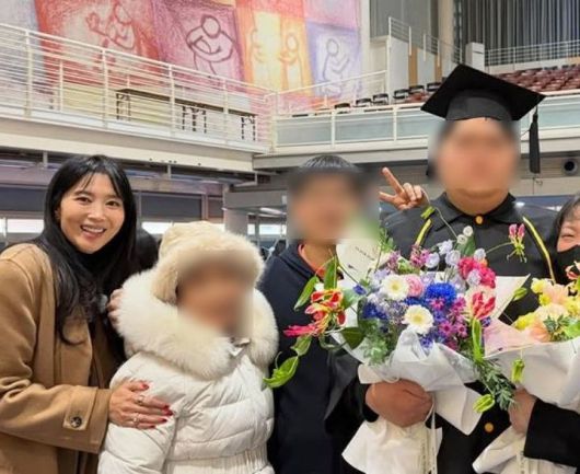 공개된 사진에는 학사모를 쓴 송민 군이 꽃다발을 든 채 오윤아 및 가족들과 기념사진을 남기는 모습이 담겼다.