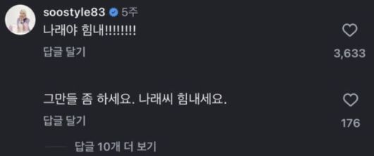 이 와중에 소녀시대·이민정 등 유명 연예인의 스타일링을 맡아온 스타일리스트 서수경이 남긴 “나래야 힘내!!!!!!!!”라는 댓글이 3천 개가 넘는 ‘좋아요’를 받으며 화제가 됐다. 또 다른 누리꾼 역시 “그만들 좀 하세요. 박나래 씨 힘내세요”라는 댓글을 남기며 응원 대열에 합류했다. 이를 두고 온라인에서는 “연예계 동료와 팬들의 응원이 동정론을 키운다”는 해석과 “지금은 응원보다 사실 확인이 먼저”라는 반응이 엇갈린다.