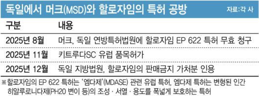 유럽 무대에서 머크와 할로자임의 법적 공방은 지난해 8월 머크가 독일에서 할로자임의 ‘EP 622’ 특허에 대해 독일 연방특허법원(Federal Patent Court)을 통해 특허 무효 소송을 제기하며 시작됐다. 머크는 미국에서와 같이 키트루다SC 출시 이후 걸림돌을 사전에 없애기 위해 할로자임의 엠다제(MDASE) 특허 무효 전략을 펼친 것이다.