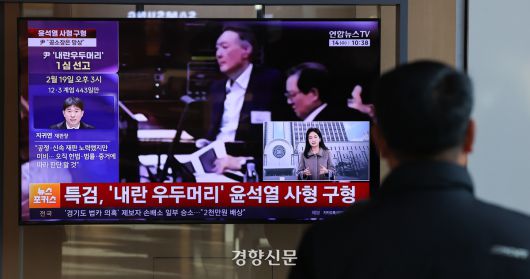 내란 우두머리 혐의로 기소된 윤석열 전 대통령에게 법정 최고형인 사형이 구형된 가운데 지난 14일 서울역 대합실에서 시민들이 관련 뉴스를 시청하고 있다. 성동훈 기자 |