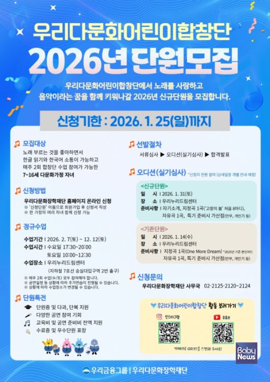 우리금융그룹 우리다문화장학재단(이사장 이종휘)은 '우리다문화어린이합창단’의 2026년도 신규 단원을 공개 모집한다고 15일 밝혔다.