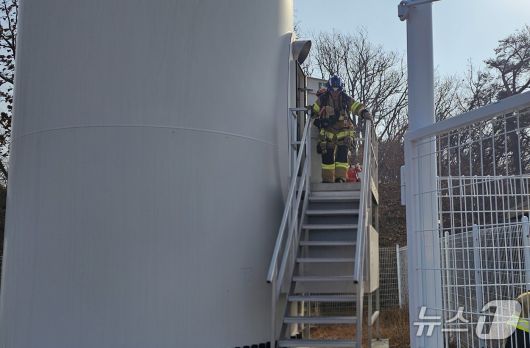 15일 오후 1시 6분쯤 경북 포항시 북구 흥해읍 매산리 풍력 발전단지의 발전기 내부에서 불이나 소방 당국이 진화하고 있다.(경북소방본부 제공. 재판매 및 DB 금지)2026.1.16/뉴스1 |
