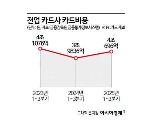 본업인 신용판매 영업을 강화하려는 노력은 '카드비용' 수치에서도 드러난다. 카드비용은 신용판매 영업 과정에서 발생하는 비용으로 개발·투자비용 등을 포함한다. 금감원 금융통계정보시스템을 통해 최근 3개년 1~3분기 수치를 분석한 결과, 2024년 3조9836억원으로 전년 대비 3% 줄었던 카드비용은 지난해 4조696억원으로 다시 2.2% 반등했다.