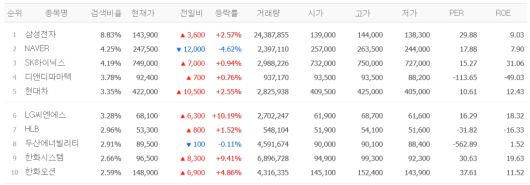 16일 네이버페이증권에 따르면 검색 상위 종목은 삼성전자, 네이버, SK하이닉스, 디앤디파마텍, 현대차, LG 씨엔에스(LG CNS), HLB, 두산에너빌리티, 한화시스템, 한화오션 등 순이었다.
