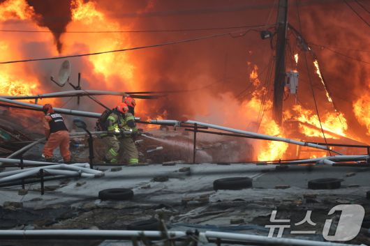 (서울=뉴스1) 김진환 기자 = 16일 오전 서울 강남구 개포동 구룡마을에서 불이나 출동한 소방대원들이 진화작업을 벌이고 있다. 2026.1.16/뉴스1