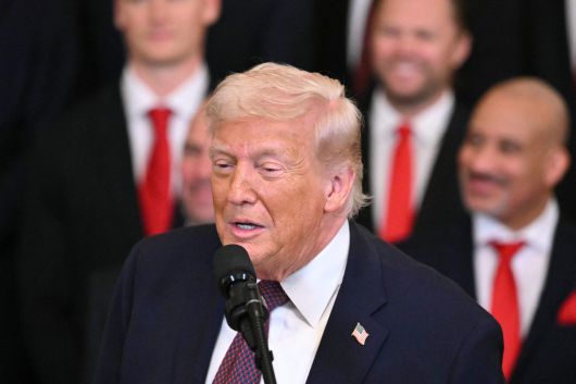 2026년 1월 15일 미국 워싱턴 DC 백악관 이스트룸에서 열린 행사에서 도널드 트럼프 미국 대통령이 2025년 스탠리컵 우승팀인 북미아이스하키리그(NHL) 플로리다 팬서스를 축하하며 연설하고 있다. [AFP] |