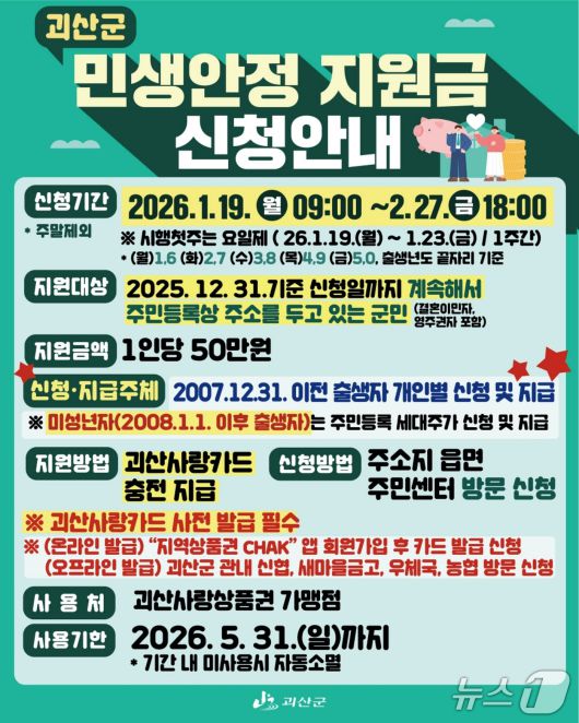 민생안정지원금은 2025년 12월 31일 기준일부터 현재까지 괴산군에 주민등록이 돼 있는 군민이면 누구나 1인당 50만 원을 준다.