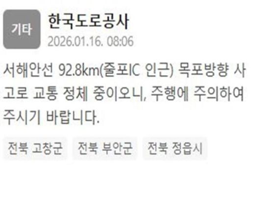 한국도로공사는 16일 오전 8시 6분께 "서해안선 92.8km(줄포IC 인근) 목포방향 사고로 교통 정체 중"이라는 내용이 담긴 재난문자를 발송했다.