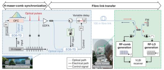 This schematic diagram illustrates the process of transmitting precise optical frequency comb signals from the observatory building to the KVN Yonsei Radio Telescope receiver to ensure accurate phase calibration. Courtesy of KAIST |