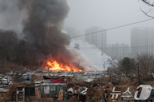 (서울=뉴스1) 김진환 기자 = 16일 오전 서울 강남구 개포동 구룡마을에 불길이 번지고 있다. 2026.1.16/뉴스1kwangshinQQ@news1.krCopyright ⓒ 뉴스1. All rights reserved. 무단 전재 및 재배포, AI학습 이용 금지.